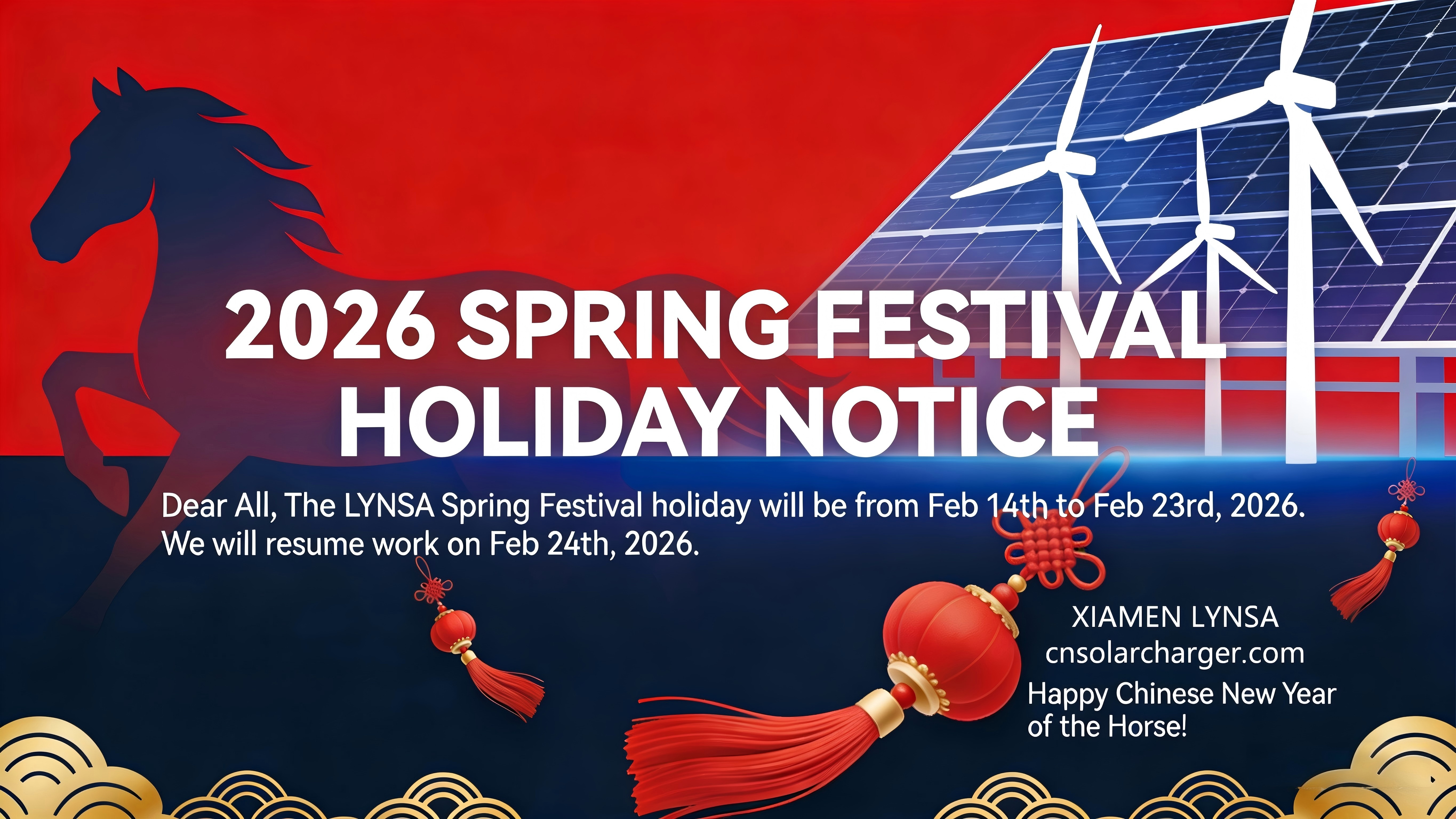 As the Spring Festival approaches, we would like to inform you about our holiday schedule. Our office will be closed from February 14, 2026 to February 23, 2026. We will resume normal operations on February 24, 2026.